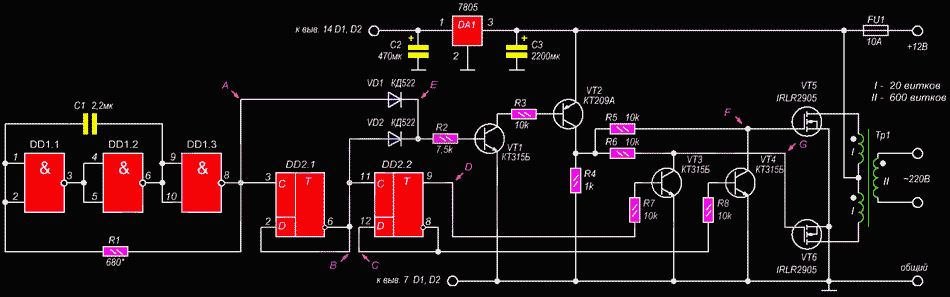 Для повышения КПД преобразователя напряжения и предотвращения сильного перегрева, в выходном каскаде схемы инвертора применены полевые транзисторы с низким сопротивлением