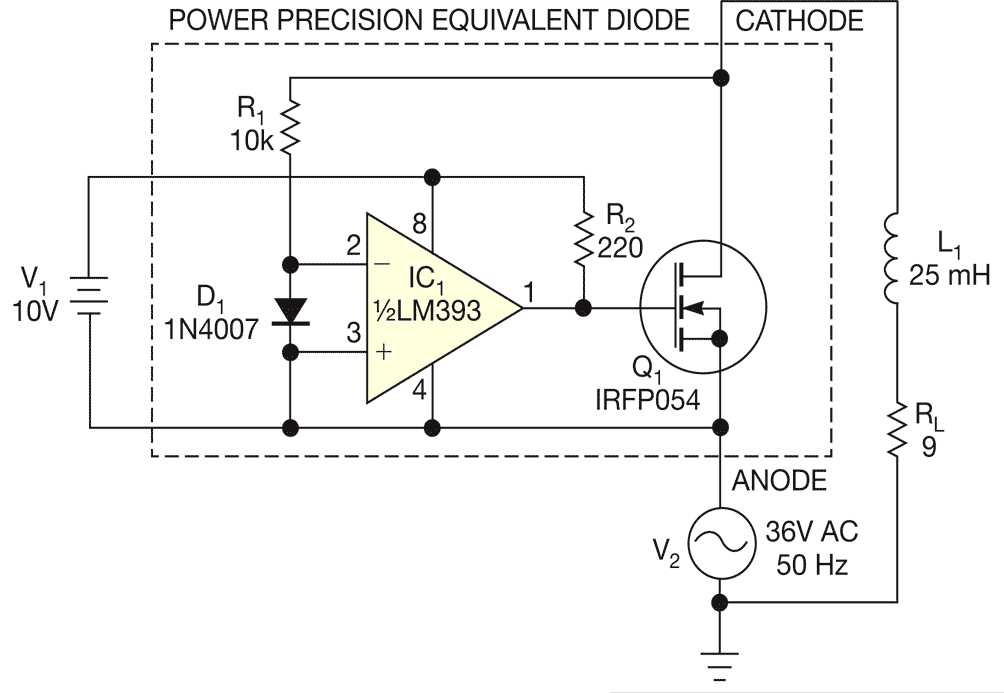 На Рисунке 1 изображена схема выпрямителя с MOSFET транзистором Q1, имеющим во включенном состоянии низкое сопротивление сток-исток. V2 представляет источник переменного напряжения 36 В. Нагрузка образована последовательным соединением резистора 9 Ом и индуктивности 25 мГн. Компаратор IC1 управляет затвором транзистора Q1 на тех отрезках времени, когда напряжение питания на аноде превышает напряжение на катоде. Таким образом, исток выполняет функцию анода выпрямителя, а сток – катода. В схеме используется способность транзистора проводить ток в направлении исток-сток. При включении Q1 происходит эффективное шунтирование паразитного диода между подложкой и стоком, благодаря чему потери мощности оказываются минимальными. При низком напряжении затвор-исток выключены как транзистор, так и паразитный диод. Диод D1 и резистор R1 выполняют функцию защиты компаратора, ограничивая напряжение на его входах.