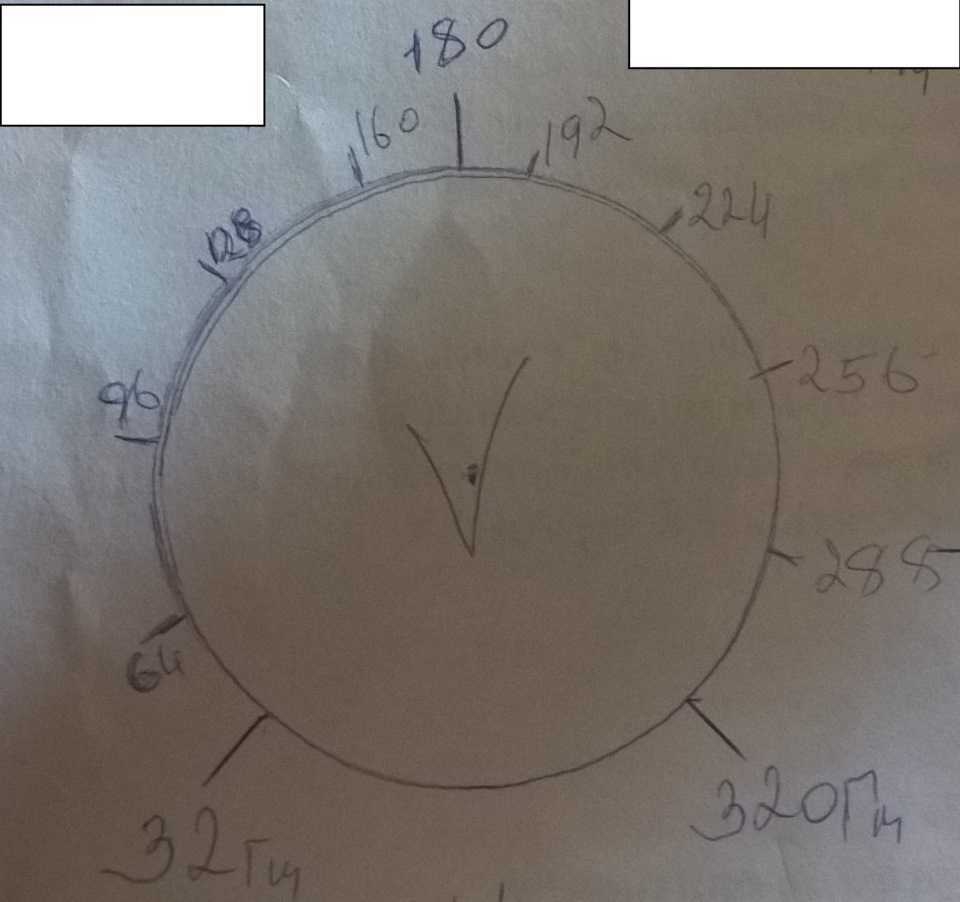 и включаем треки:Трек № 1, 2, 3 из корня архива. По ним определяем правильность подключения динамиков на низких средних и высоких частотах. Когда голос звучит в фазе, то звук должен собираться в центре салона либо перед вами и вы четко должны слышать что он звучит посередине. Когда голос звучит в противофазе, звук должен рассыпаться по салону и звучать слева и справа отдельно. Если у вас все получается наоборот-то значит полярность какого-то из динамиков перепутана. Проверяем правильность подключения, исправляем косячки и продолжаем.Настройка среза частот на моем усилителе начинается с 32 Гц и заканчивается 320 Гц. Поэтому, для удобства нарисовал вот такую шкалу, чтобы было примерно понятно, на сколько поворачивать регулятор.