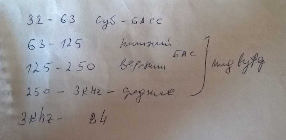Настройка эквалайзера.На средней громкости запускаем по очереди песни из папки «тест треки» и слушаем.На треке «2.барабаны» можно оценить работу фронтальных динамиков. Подрегулировать эквалайзером в магнитоле, чтобы звук не был бубнящим, навязчивым, настойчивым. Был максимально четким и приятным. Аналогично слушаем треки «3.средние» и «4.пищалки».Для меня было совершенно непонятно, как разобраться в частотах, Герцах и т.д., поэтому сделал вот такую шпаргалку.