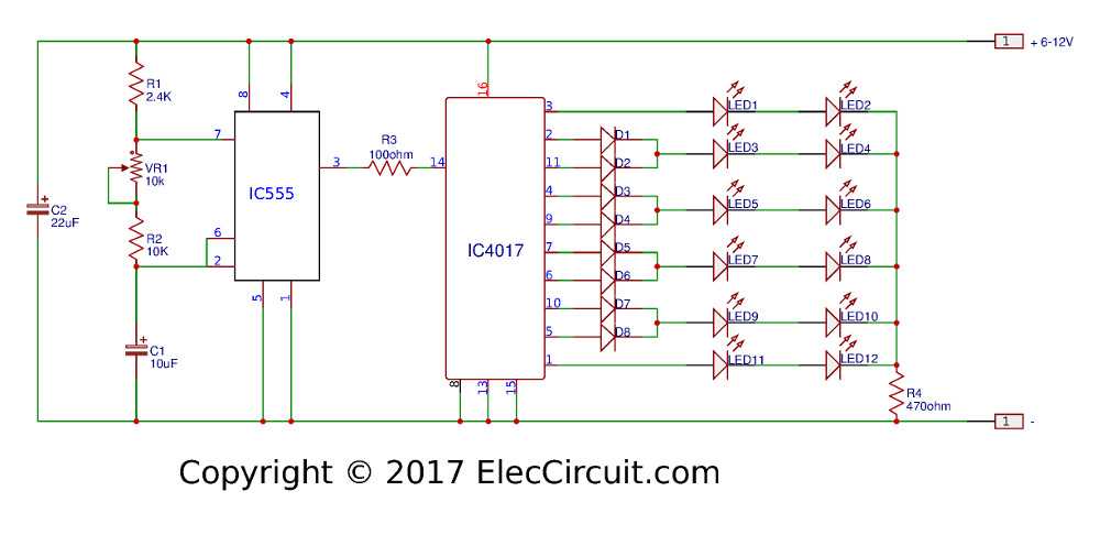 Which it is one of the 4017 project that uses 12 LED lamps, arranged in 2 rows, each row of 6 LEDs. A green one and a red one, alternatively. You can use a different color for this.