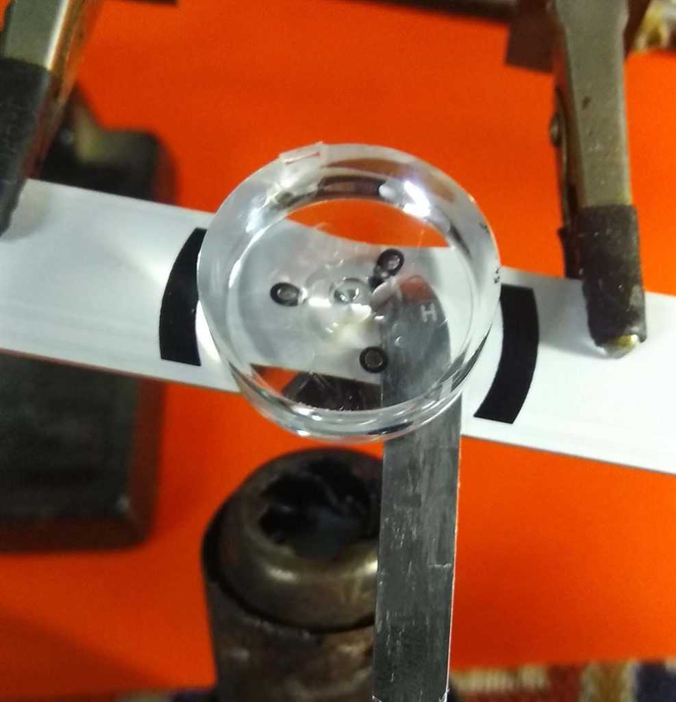 После этого устанавливаем линзу. Пытаемся установить линзу как можно ровнее, чтобы ее центр попадал ровно на цент светодиода.