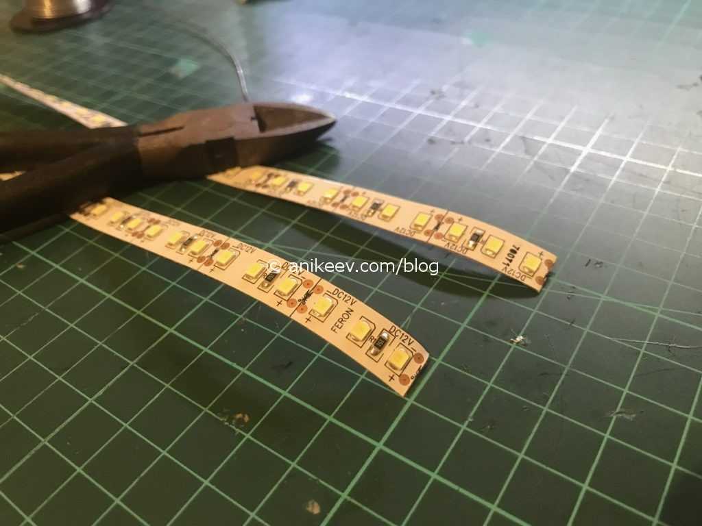 Попытка сэкономить на ленте и не покупать ленту с 12 светодиодами на 1 метр была ошибкой, в данной ленте светодиоды расположены в 2 раза чаще, не 6 штук на 10 см как в моем случае, а 12 штук
