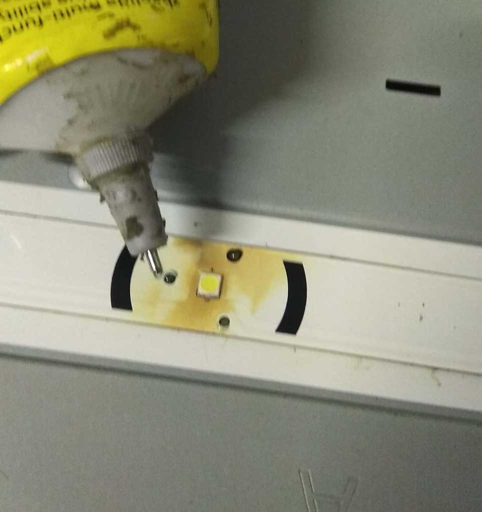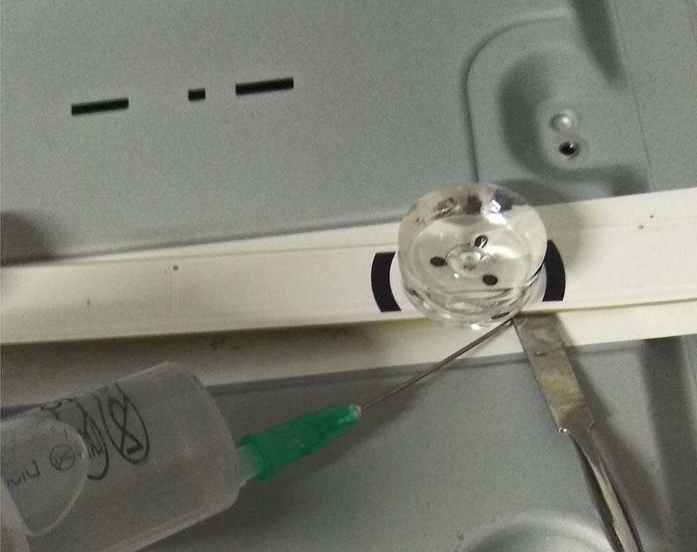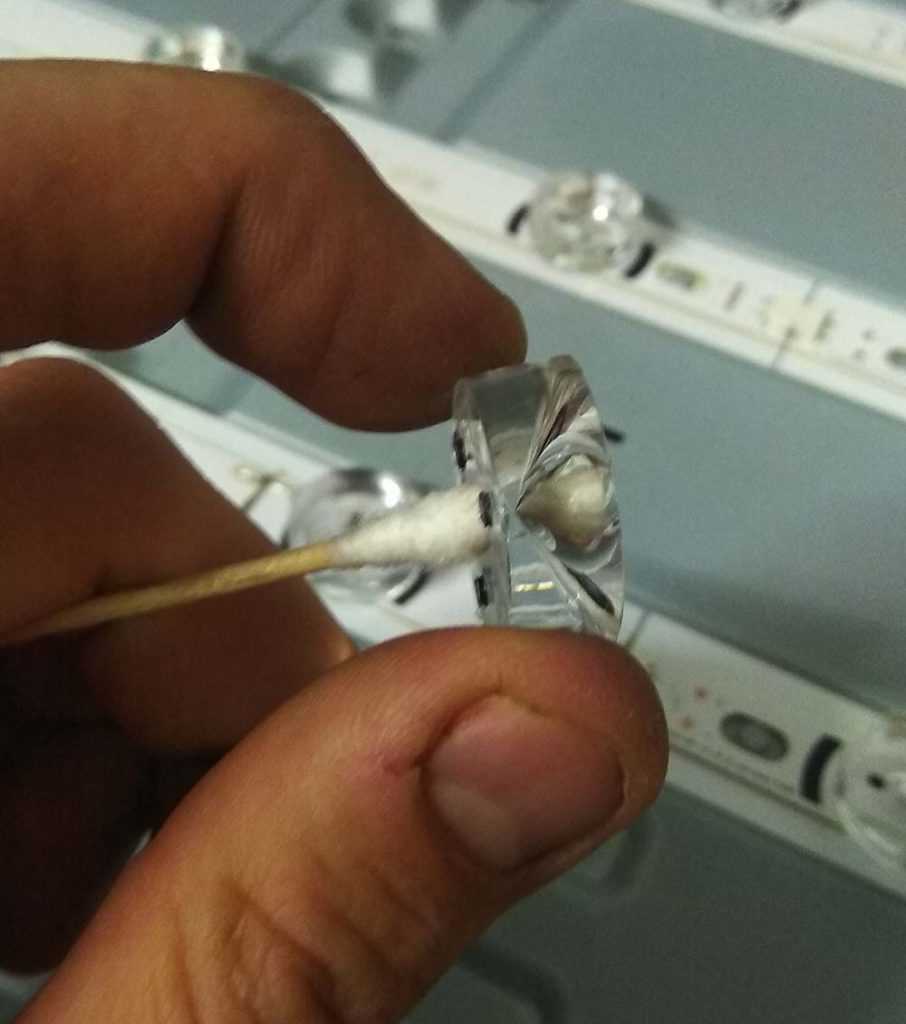 Очень важно, чтобы клей не попал на светодиод, тем самым не испачкал внутреннюю часть линзы