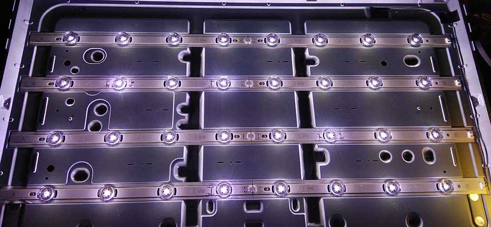 Когда ремонт Led системы телевизоров марки LG был осуществлен полностью, прежде, чем производить окончательную сборку, подключаем напряжение к планкам и проверяем свечение всех светодиодов