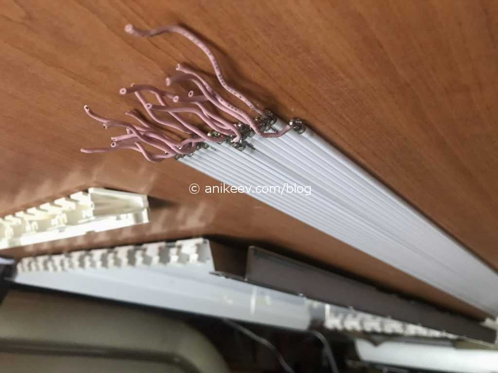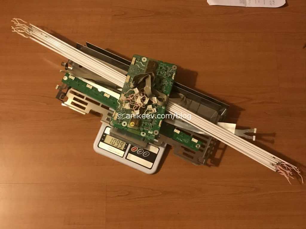 Если посчастливилось купить готовые линейки от производителя — задача решается просто: они устанавливаются на место старых целиком. Даже без проверки отдельных диодов. Есть и более сложный путь. Найдя сгоревшие диоды, их вырезают вместе с участком подложки с проводниками. На это место помещают такую же деталь, получаемую из новой линейки. Все, что останется — восстановить дорожки, то есть подпаять в разрыв пару коротких проводников.