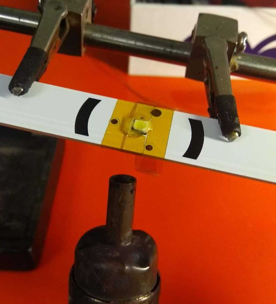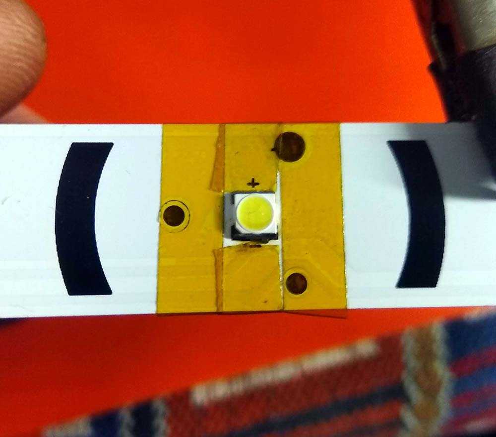 Еще одна подсказка, если нужны светодиоды 3В, их можно извлечь со светодиодной ленты, которые свободно продаются в магазинах. Значит, определено, сколько сгорело светодиодов, и нашлось чем их заменить. Вооружившись паяльным феном, снимают планки, которые были прикреплены производителем при помощи двухстороннего скотча, для этого прогревают эти места, тогда планки легко отходят. Чтобы было легче выпаять диод, подогревают и плату снизу. Выковыривают (выпаивают) с линзы сгоревшие диоды, припаивая новые, следя за правильным их размещением соответственно полюсам.