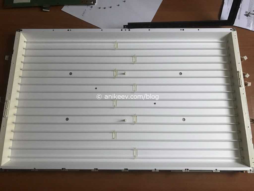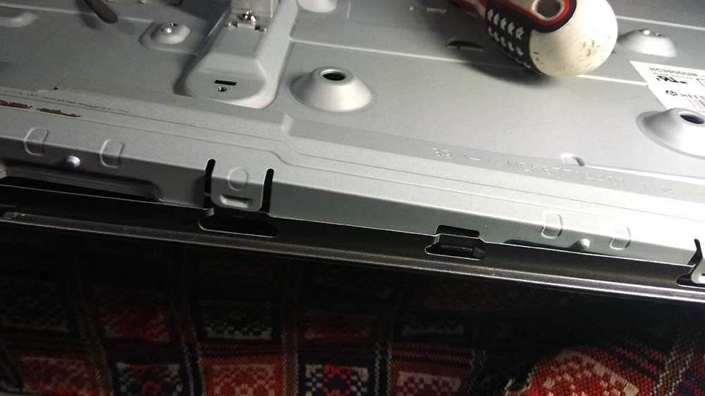 Для того чтобы разобрать телевизор и добраться до светодиодов, необходимо снять переднюю рамку. Откручиваются винты по периметру, аккуратно отгибается металлическая планка и поднимается вверх. Повторить со всех четырех сторон монитора.