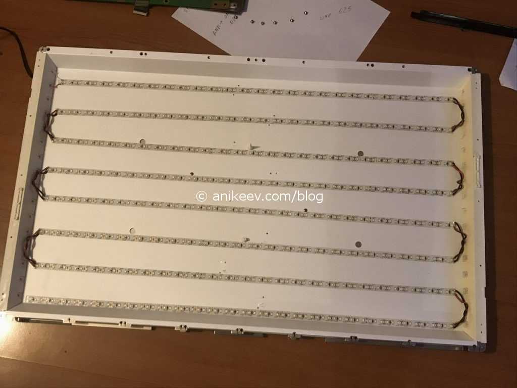 Наконец матрица вместе с нашими ленточками была собрана, настал момент оценить качество работы — хватает ли яркости лент для нормальной подсветки изображения и другие параметры. С яркостью было все практически нормально, если она и снизилась то очень незначительно, проблема здесь была в другом: светодиоды LED ленты у нас стояли слишком разрозненно, лента была взята самая дешевая 60 светодиодов на 1 метр, причем светодиоды там стояли с промежутками и были слишком яркими для таких целей.