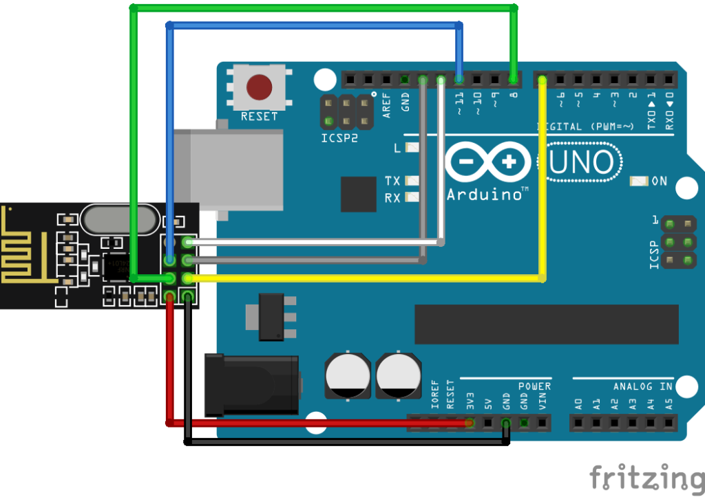 NRF24L01 Arduino GND GND VCC 3.3v CE D7 CS D8 SCK D13 MOSI D11 MISO D12