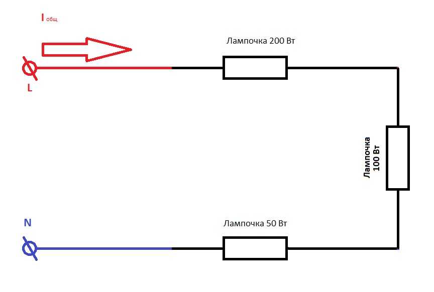 Ток проходит по цепи приборов, состоящей из резисторов, ламп или других нагрузок, протекая через каждый включенный в электроцепь прибор. В собранной таким способом цепи отсутствует эффект деления и накопления заряда на разных ее участках. Соответственно, физическая величина ампеража будет на всех участках одинаковой.