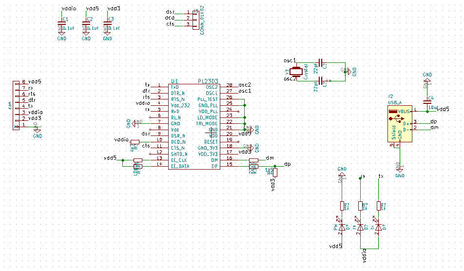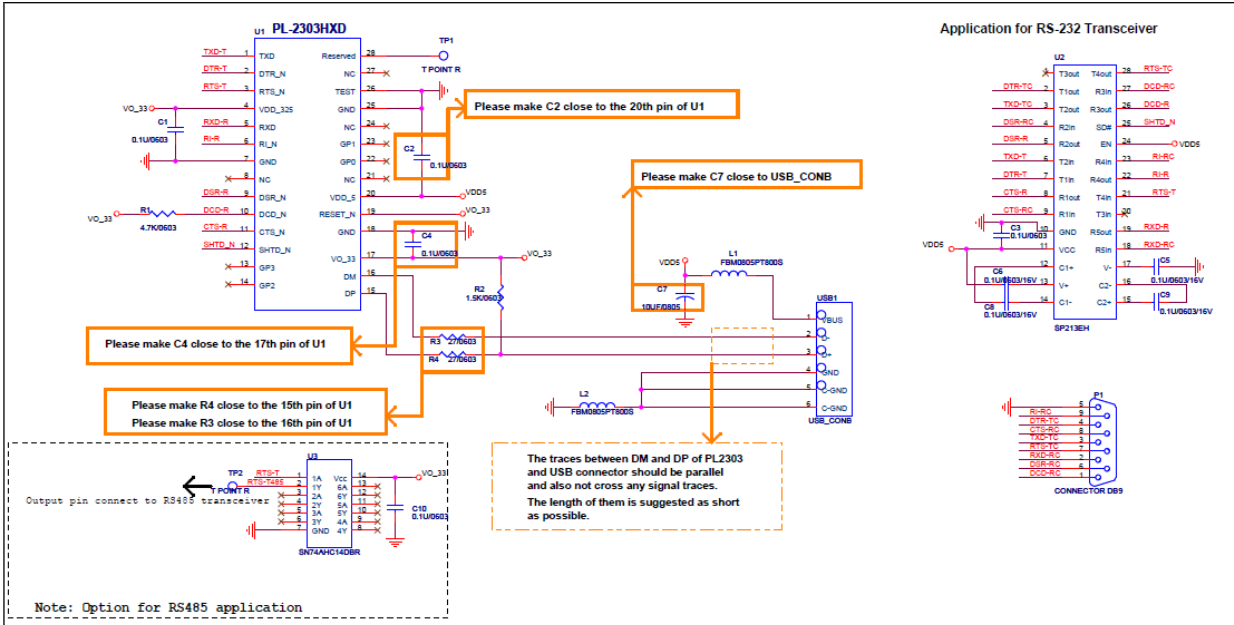 Любая схема должна начинаться с чтения Datasheet. Производитель микросхем очень заинтересован в том, чтобы купили именно его чип. В документации он обычно максимально подробно разбираем как пользоваться микросхемой, прикладывает схемы и пишет тонкости и особенности реализации прибора на этом чипе. Посмотрим что советует нам производитель (из документации на чип pl2303HXD):