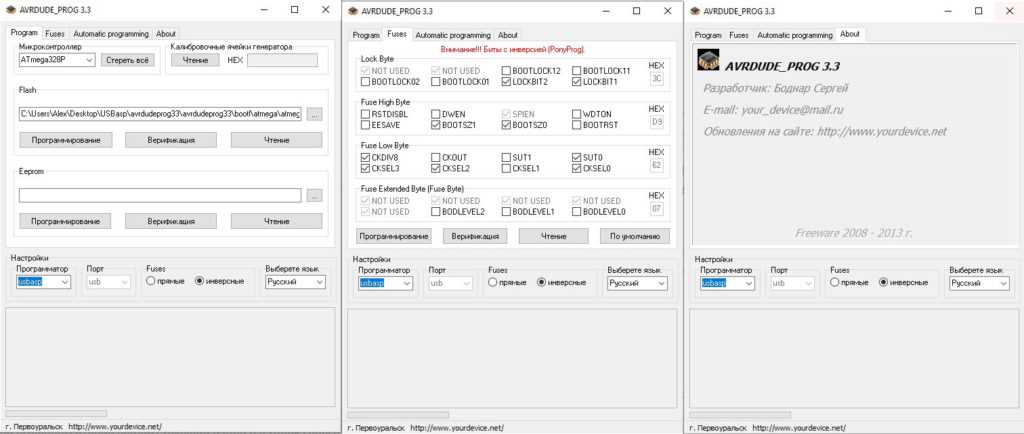 Avrdudeprog – утилита от русского программиста, являющаяся удобной оболочкой для avrdudue. Скачать AVRDUDE_PROG можно с официального сайта (прямая ссылка на загрузку, на всякий случай зеркало на моём ЯД и FTP этого сайта). В рамках этого урока, программа умеет следующее: