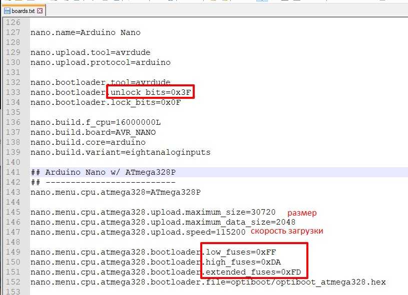 Файл конфигурации называется boards.txt и найти его можно в папке с ядром Arduino: C:\Program Files (x86)\Arduino\hardware\arduino\avr\boards.txt. Документацию на boards.txt можно почитать здесь. При желании можно вывести нужные фьюзы через калькулятор (читайте выше), изменить их в boards.txt (главное не запутаться, для какой выбранной конфигурации платы делается изменение) и прошить в МК, нажав Инструменты > Записать загрузчик.