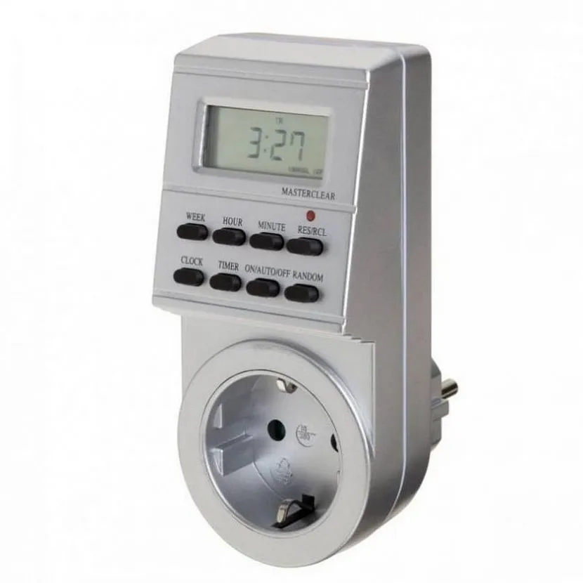 Не менее популярной моделью, которая встречается на рынке, является таймер-розетка Masterclear. Она имеет более понятный алгоритм настройки, но следует быть готовым, что все надписи выполнены на английском: