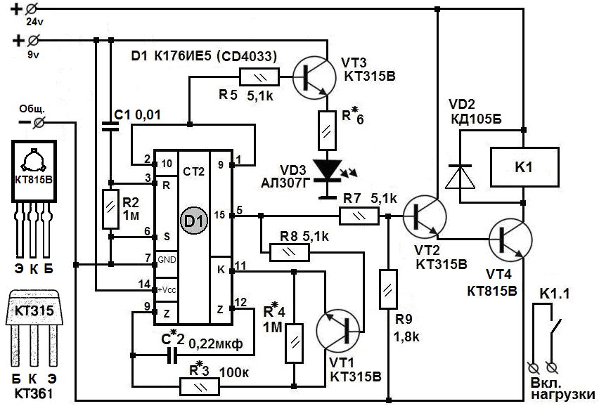 Все транзисторы в схеме – КТ315. Реле – РЭС-6, РЭС-22. R* — подбирать по току через светодиод от 9 Вольт. R3 – единицы килоом. R4 – сотни килоом — единицы мегаом.
