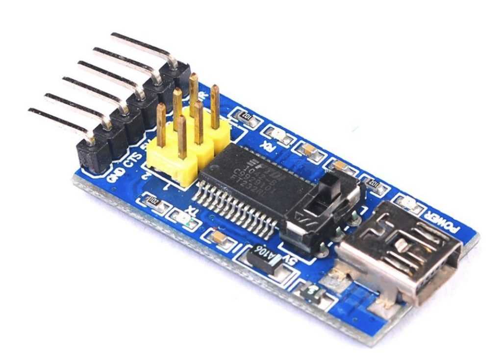 Данный программатор весьма и весьма популярен, в виду своего раннего происхождения и множеством удобных функций. Он появился на свет так давно, что на нем распаян разъем Mini-USB, который мне пришлось побегать поискать, чтоб его подключить к USB-порту. Модуль построен на чипе FTDI FT232RL.