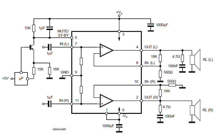Управление микросхемой осуществляется подачей соответствующих напряжений на вывод 5 (Mute/Stand-by) микросхемы DA1.