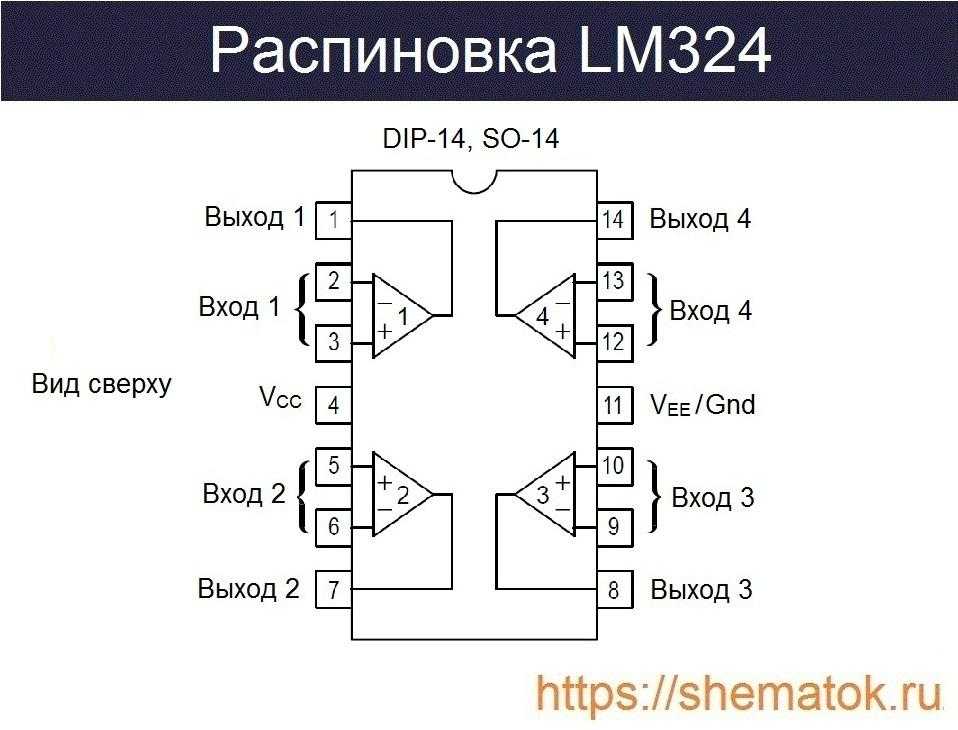 Микросхема LM324 — операционный усилитель общего применения. LM324 выпускается в двух типах корпусов: DIP и SOIC. В состав LM324 входят четыре независимых операционных усилителя. Диапазон напряжений от 3в до 30в (+15, -15). Микросхема LM324 может работать как при однополярном, так и при двухполярном питании. Диапазон рабочих температур от 0 до +70 градусов по Цельсию.
