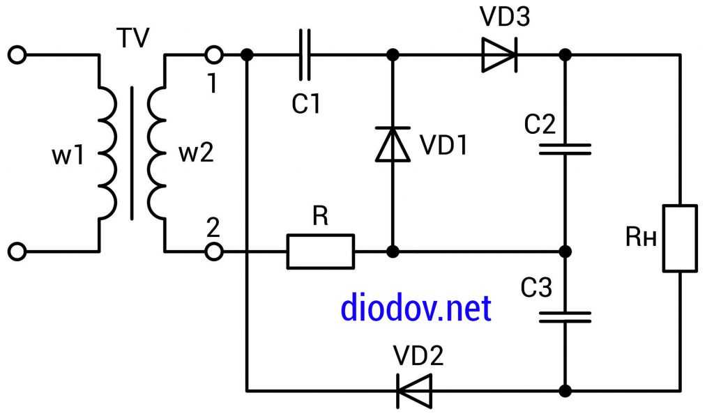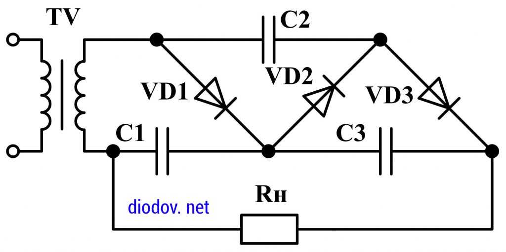 Процессы в схеме утроения напряжения протекают в такой последовательности: сначала заряжаются конденсаторы С1 и С3 через сопротивление R и соответствующие диоды VD1 и VD3. В следующий полупериод С2 через VD2 заряжается до удвоенного напряжения (С1 + обмотка) и на сопротивлении нагрузки получается утроенное значение.