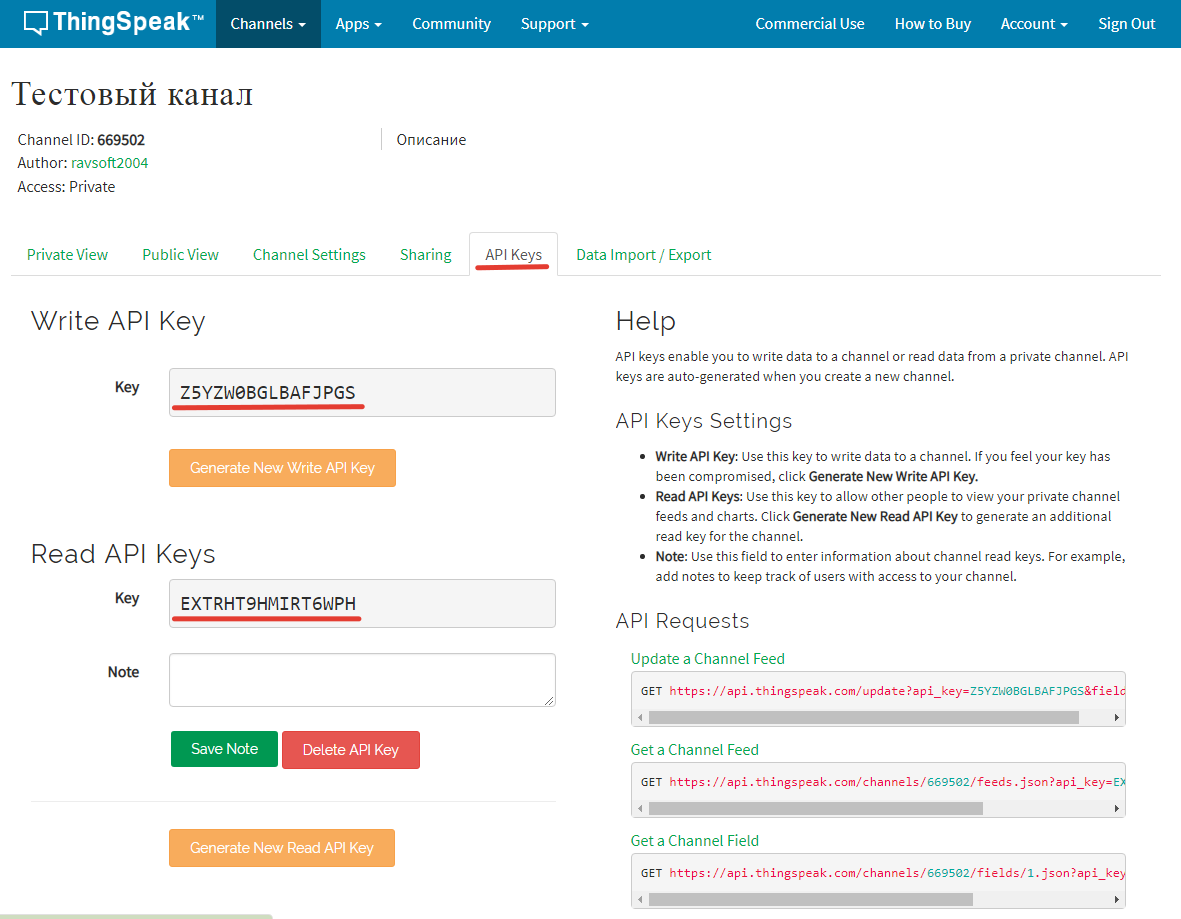 10. Здесь нам понадобится Write API Key – его нужно указать в скетче. Read API Key понадобится при настройке виджетов на смартфоне для отображения данных. Сохраним эти данные куда-нибудь.