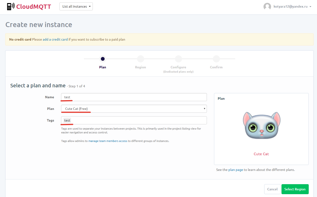 Итак, регистрируемся на сервисе CloudMQTT.com, подтверждаем учетную запись через письмо, которое придет к Вам на почту. Сразу после входа мы попадем в список “List all instances“, который сейчас пуст. Нажимаем зеленую кнопку “+ Create New Instance“, заполняем название экземпляра брокера, выбираем тарифный план и задаем метку. Метки ни на что не влияют, а служат только для группировки списка созданных экземпляров и упрощения навигации.
