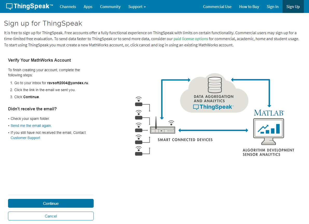 5. Дожидаемся письма на почту, подтверждаем учетную запись, нажимаем “Continue”: