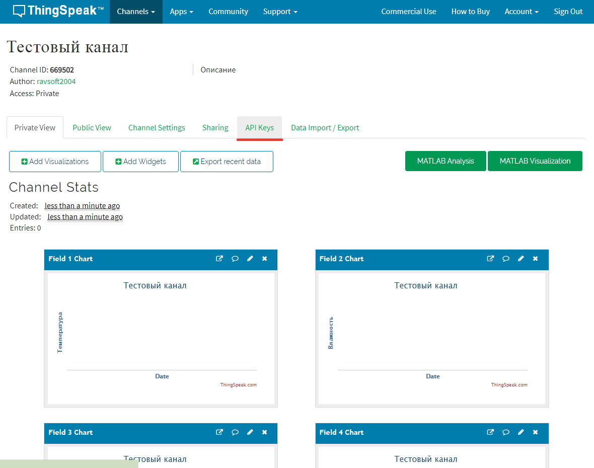9. После сохранения канала попадаем в “приватный просмотр” данных канала, где и данных-то пока нет. Переходим во вкладку “API Keys”: