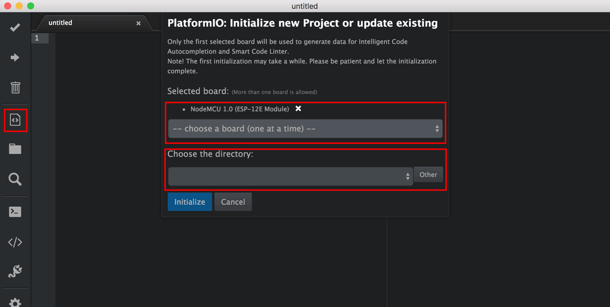 On the popup, select the board and the directory to place your project. Since we’re using a NodeMcu dev kit, select from the dropdown. As you can see, PlatformIO supports a wide variety of boards. Once you’ve got the options selected, click «Initialize». This will take a while the first time as PlatformIO downloads and installs the correct tools for your board. Once it’s done, you’ll see some automatically generated files.