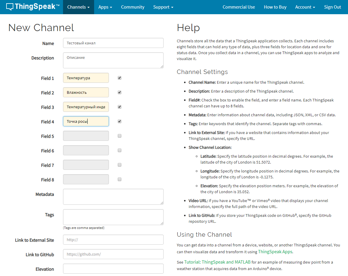 Повторяем шаги 7-10 пока не будет добавлено нужное количество каналов. В бесплатном режиме ThingSpeak сейчас допускает не более 4 каналов на аккаунт, но можно создать несколько аккаунтов. Для датчиков BME280 нужно будет указать дополнительные поля для хранения данных об атмосферном давлении.