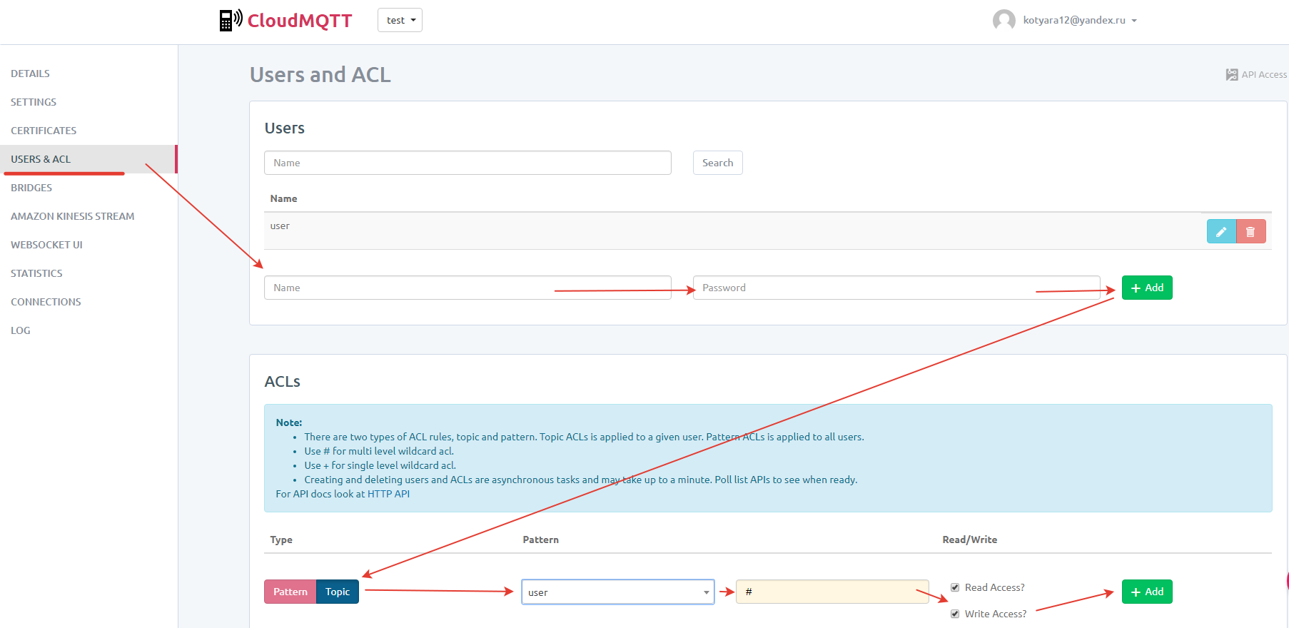 Имя пользователя и пароль, которые указаны на этой странице лучше не использовать в скетче. Для “клиентов” создадим другого пользователя (а можно и не одного). Для этого нажимаем меню “USERS & ACL“, вводим желаемое имя пользователя и пароль, добавляем пользователя в список. Вот это имя и пароль мы и будем использовать в скетче в дальнейшем. А также и в мобильных клиентах на смартфоне при просмотре данных из экземпляра. Можно настроить разных пользователей для записи в топики с устройства и для чтения данных на смартфоне.