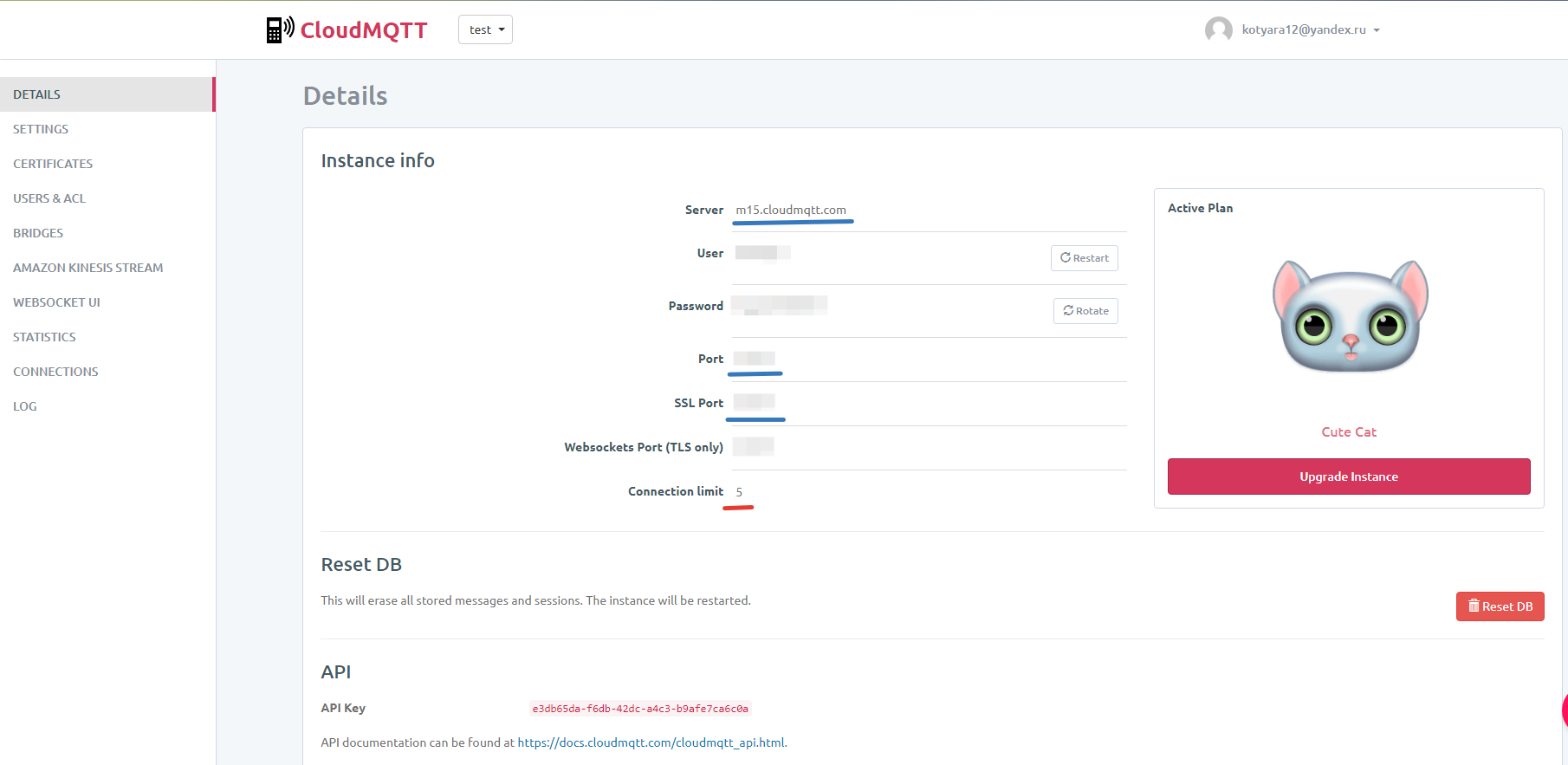 Для себя я выбрал сервис CloudMQTT.com. Просто потому, что в сети куча примеров как это сделать. На бесплатном тарифном плане “Cute Cat” сейчас можно подключать к каждому виртуальному экземпляру брокера (instance) до 5 клиентов одновременно (раньше было 10, судя по скриншотам в интернете). Количество топиков при этом не ограничено. Пять подключений – это много или мало? Ну вот у меня например: данное устройство в гараже – это раз. Второе будет стоять в доме и контролировать доступ в сеть, при необходимости перезагружать CPE210 с роутером и выполнять авторизацию через SMS – это два. Клиент для управления на смартфоне – это три. В принципе, достаточно. Но! Зашел посмотреть данные с компьютера – сразу появилось еще подключение. А если нужно смотреть данные не с одного телефона, а с нескольких? Или выводить данные на LCD-дисплей где-то еще – то пяти подключений не хватит однозначно. Впоследствии пришлось перенастроить устройства на другой облачный брокер, который не так удобен, но зато позволяет бесплатно подключать до 100 клиентов. Но для примера нам вполне достаточно и CloudMQTT.com.