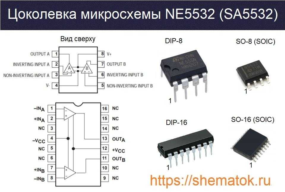 Как и большинство микросхем, ne5532 выпускается в стандартных пластиковых корпусах для дырочного или поверхностного монтажа на плату. Соответственно DIP или SO (SOIC). В большинстве случаев имеет восемь металлических выводов, но иногда встречаются и шестнадцатипиновые экземпляры. В последнем случае часть контактов не используется. Цоколевка представлена на рисунке.