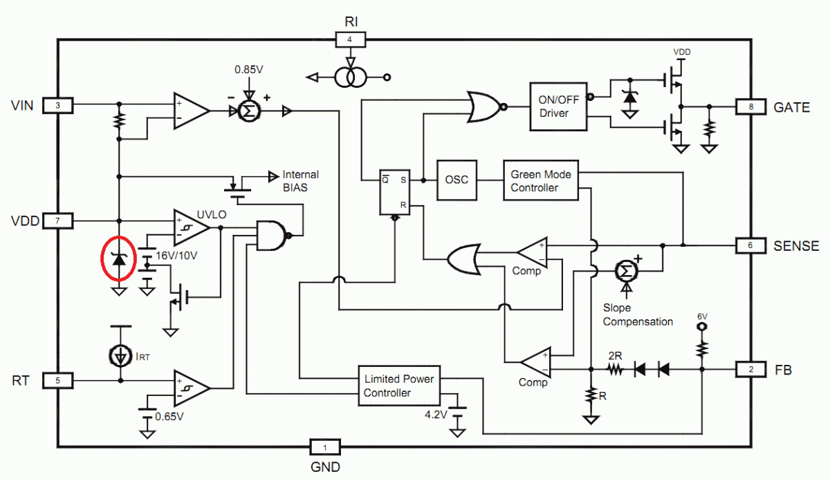 Микросхема довольно критично относится к повышенному напряжению, и как правило выходит из строя, а точнее внутренний стабилитрон, поломка которого, приводит к тому, что микросхема не может запуститься. Напряжение на VIN (3 нога) после выхода из строя внутреннего стабилитрона (на рис. 1 обведен красным кружком) составляет 4-6 В, что фактически блокирует работу по UVLO (16В включение, 10 выключение).
