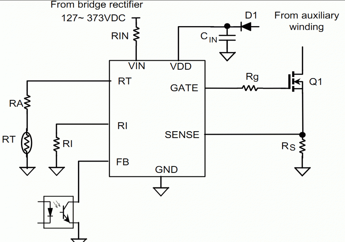 От внутреннего опорного источника тока заряжается внутренний конденсатор тактового генератора, R9 является времязадающим для внутреннего генератора ШИМ SG6841 (нога 4, RI) . Рабочая частота составляет 50 – 90кГц.