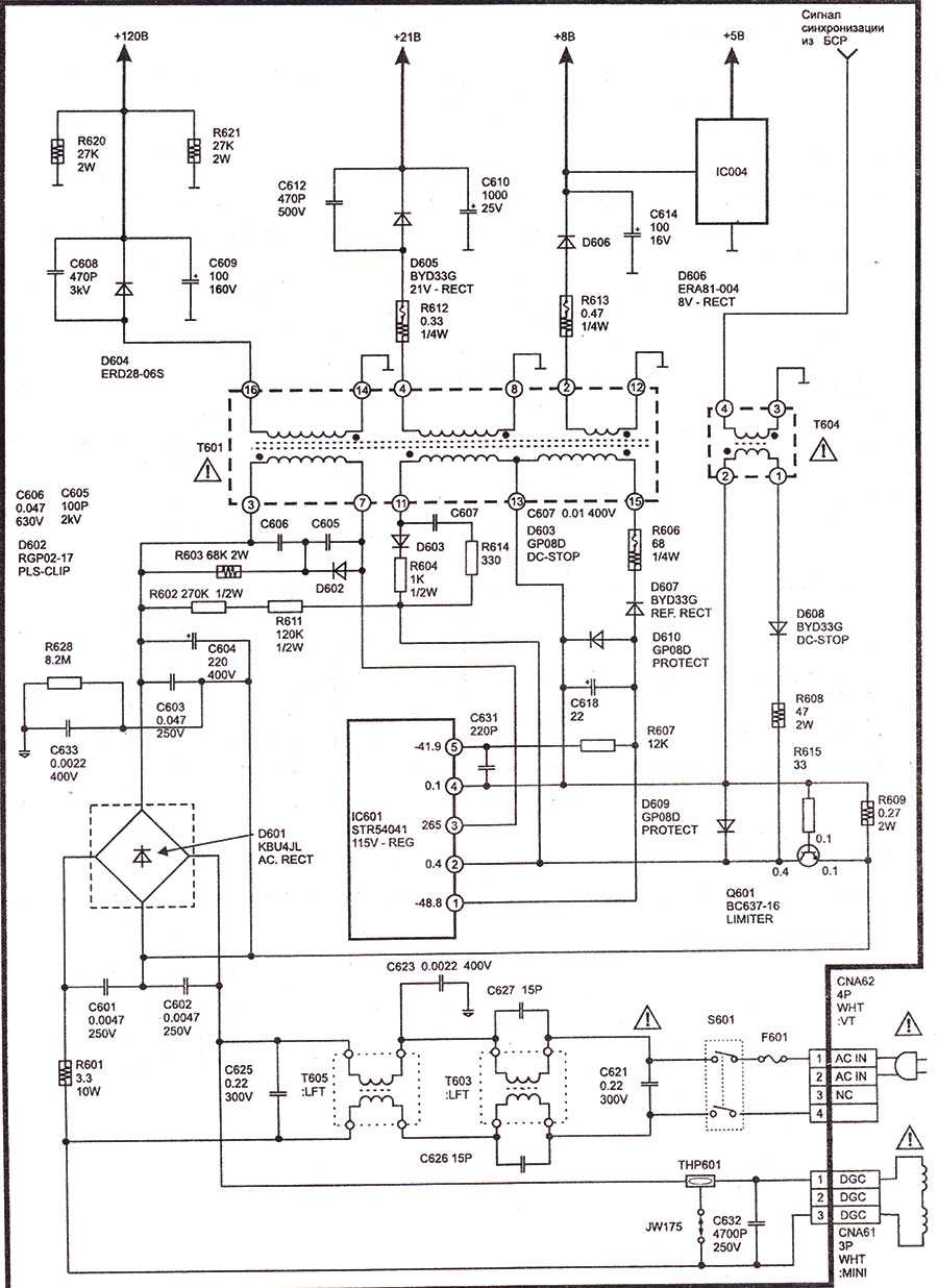 Трансформатор Т604 является элементом гальванической развязки. Сигнал синхронизации подается непосредственно на базу силового ключа (2 вывод IC601).
