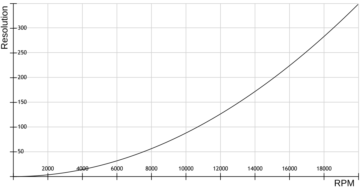 The measuring resolution depends on the resolution of the timer/counter, which is in fact its clock frequency. Due to the calculation formula, the RPM value is not proportional to the value of the counter, it is rather hyperbolic. This also means that the measurement resolution is not constant over the entire measurement range. With the set clock frequency of the timer/counter of 18.75 kHz, the following resolution results depending on the measured RPM: