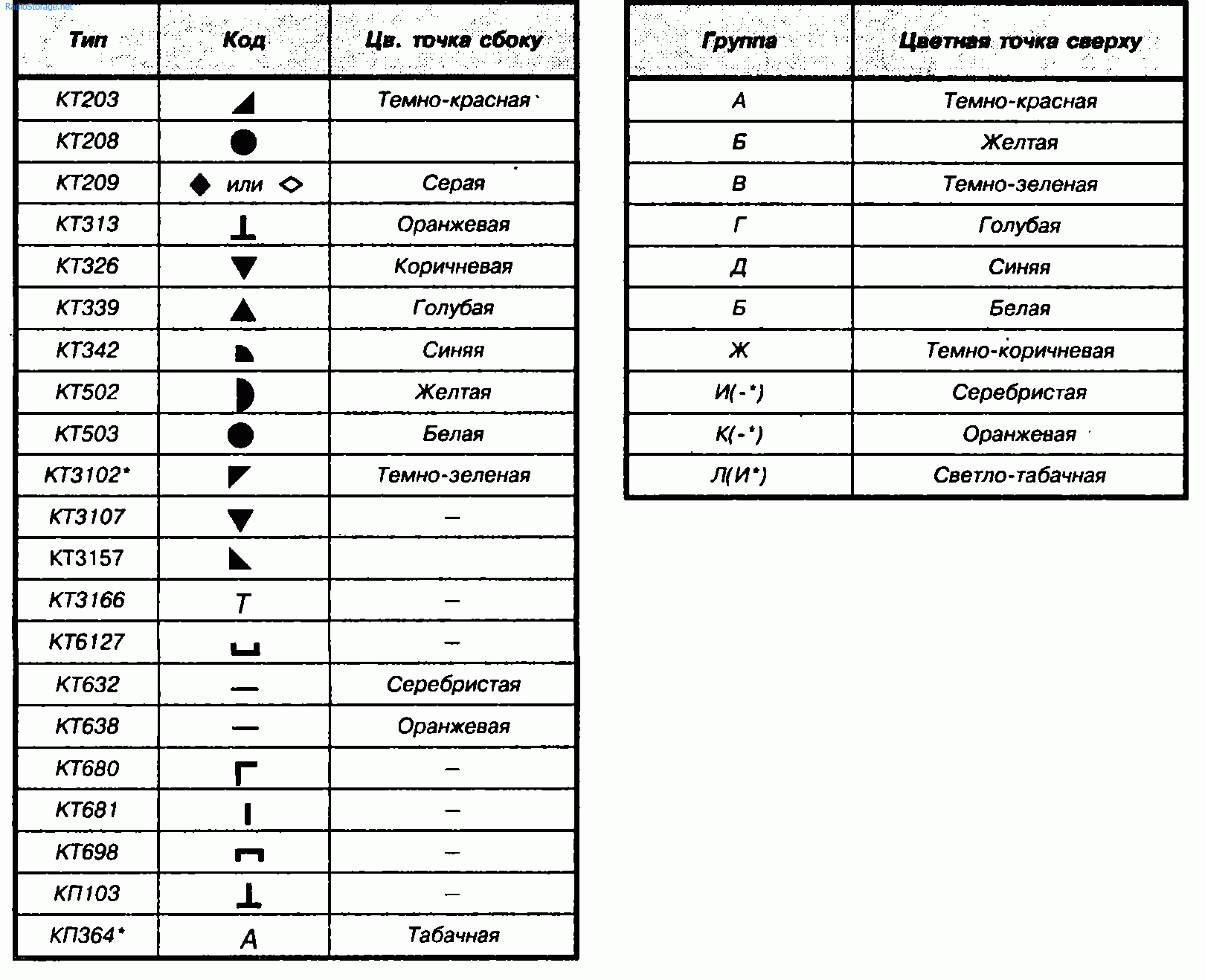Таблица 1. Цветовая и кодовая маркировки маломощных среднечастотных и высокочастотных транзисторов.