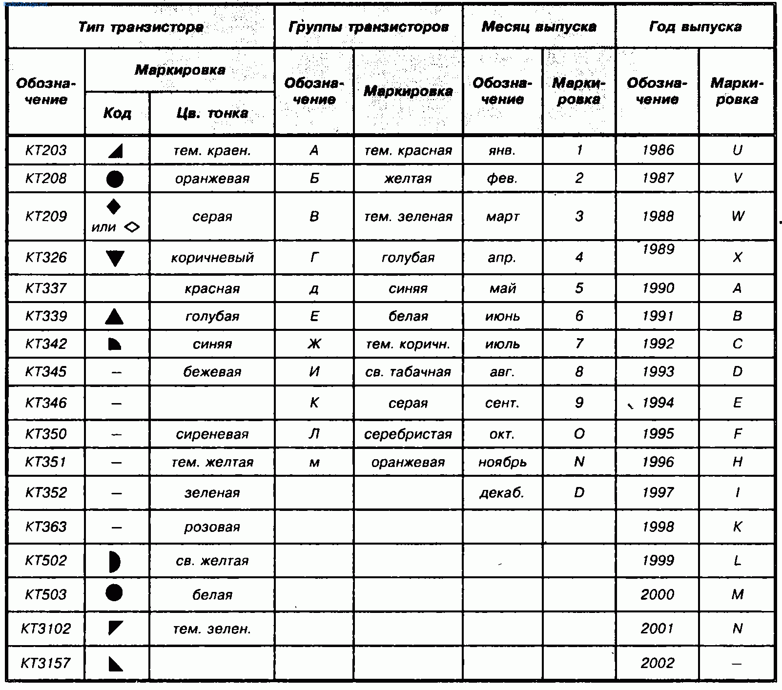| Тип транзистора | Группы транзисторов | Месяц выпуска | Год выпуска | ||||