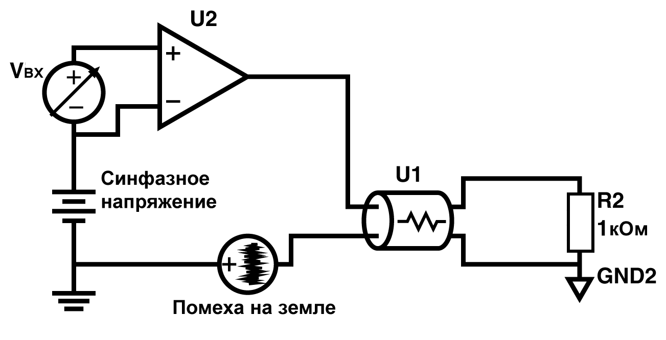 На этом рисунке U1 представляет линию передачи с потерями, а R2 – устройство на приемной стороне, которое преобразует ток в некоторую команду или значение измерения.