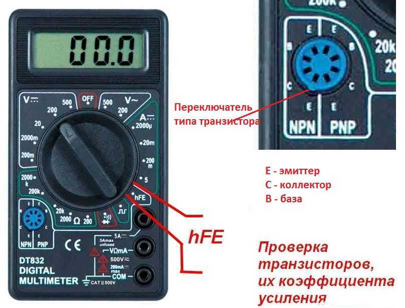 Первым делом переводим переключатель диапазонов (большую ручку) в соответствующее положение. Опознать режим можно по надписи — hFE. Перед тем как проверить транзистор мультиметром, определяемся с типом NPN или PNP.
