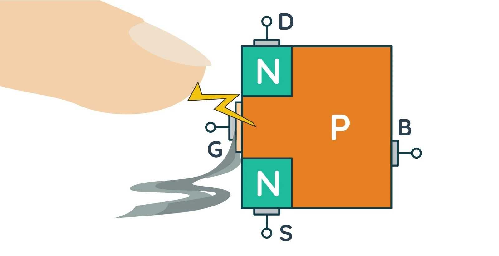 В отличие от биполярных транзисторов, полевые МОП-транзисторы очень чувствительны к электростатическим зарядам. Такие заряды накапливаются повсюду, в том числе на поверхности нашего тела. Характерный «электрический удар» ощущается при разности потенциалов в тысячи вольт. Такие же напряжения могут накапливаться в структуре транзистора, поскольку его затвор идеально изолирован от стока и истока.