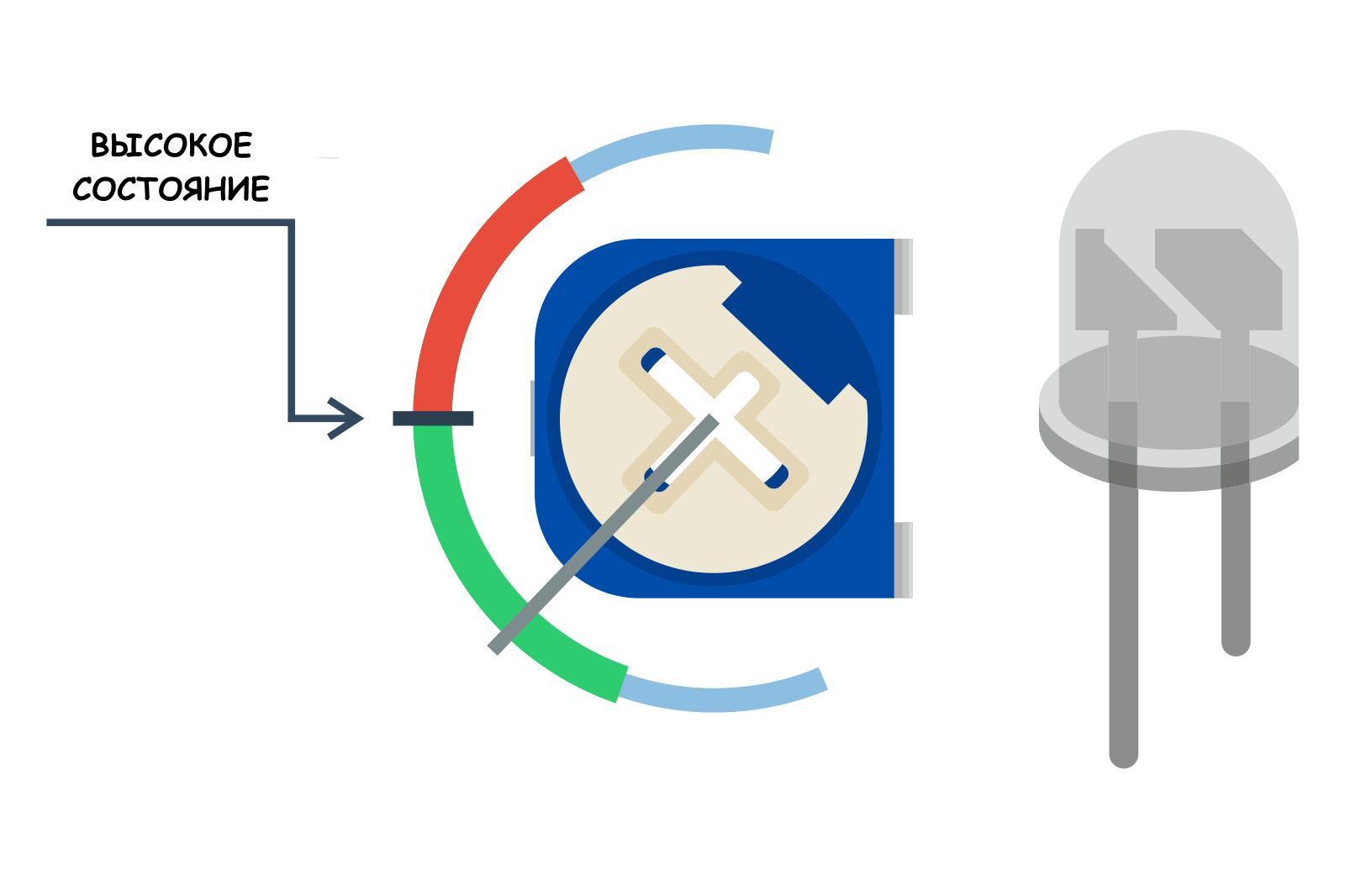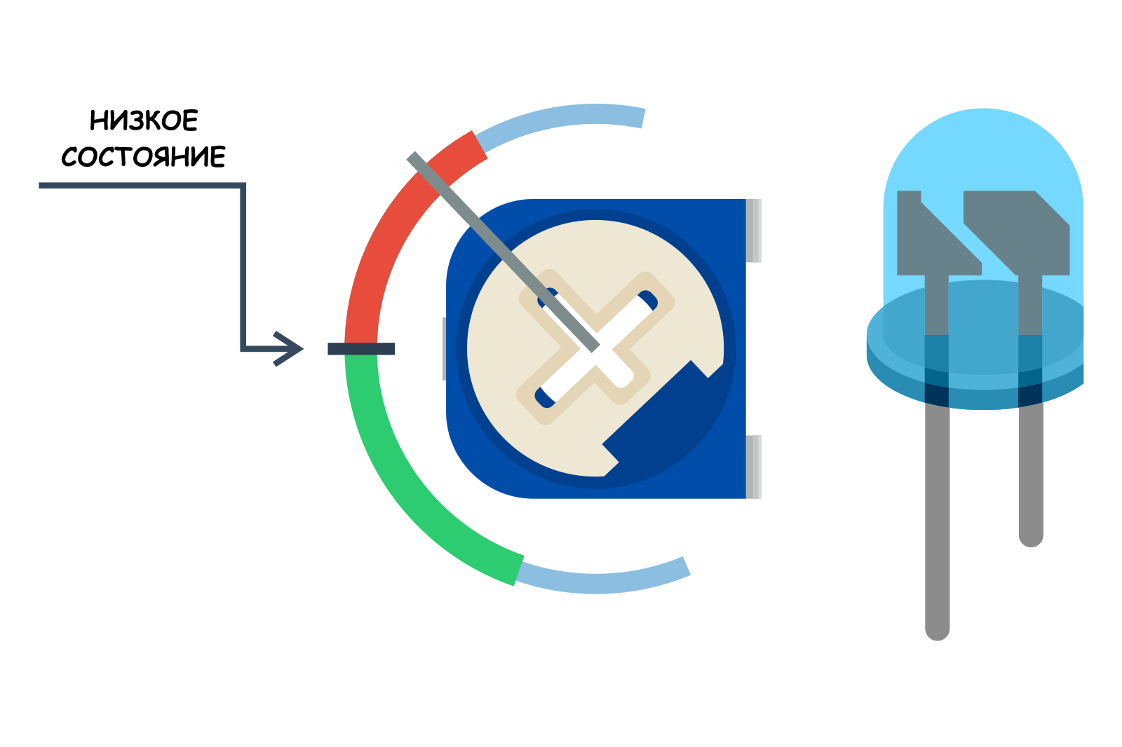 Включаем питание и наблюдаем за диодом, медленно поворачивая потенциометр. При низком состоянии светодиод должен гореть, а при высоком — нет.