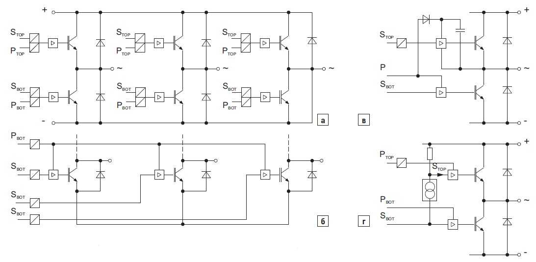 Вариант на рис. 13б содержит раздельные каналы потенциальной изоляции для всех драйверов ТОР и только один общий изолятор для драйверов нижнего уровня ВОТ. Как правило, такая структура применяется в маломощных схемах, кроме этого, она широко распространена в интеллектуальных модулях (IPM).