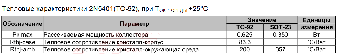 У большинства производителей значения параметров, для PNP-структур, указано со знаком минус. Имейте ввиду, что таким образом они указывают обратное напряжение на P-N переходе (на коллектор — минус, на базу плюс). Ниже, в таблице, приведены все электрические величины для 2N5401 при температуре +25 0 С.
