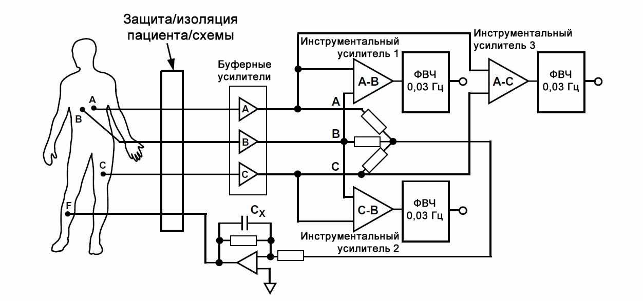Все три инструментальных усилителя снимают разность сигналов с электродов датчиков, а последний электрод «F» действует как земля. Для этого устройства используются измерительные усилители, поскольку биопотенциальные электроды улавливают огромное количество шума от линий электросети, который необходимо ослаблять, чтобы устройство могло давать точные показания.