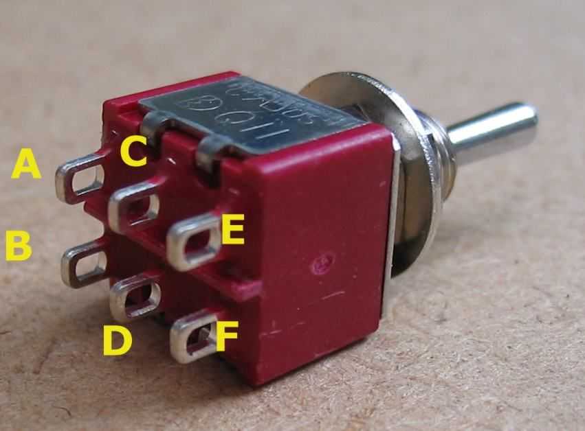 Фото №2: Припаяйте «плюс» батарейного отсека к контакту «С», а «минус» – к контакту «D» переключателя. Затем припаяйте два красных провода к контактам «Е» и «А», а два черных провода к контактам «F» и «В».