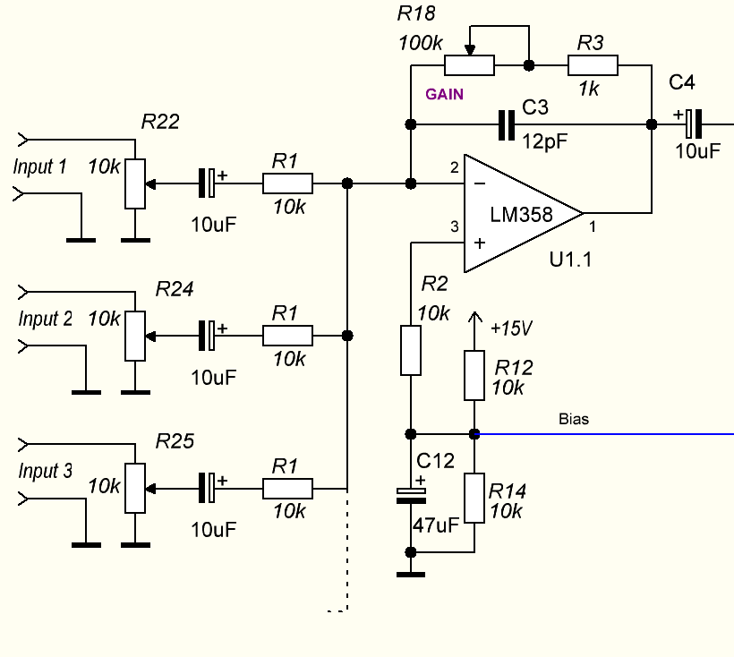 Как я уже упоминал выше, вы можете добавить к этому усилителю неограниченное количество аудио входов, сделав небольшой микшер аудио сигналов. На схеме показано как добавить три входа. Вы можете добавить сколько угодно входных ячеек. Это превращает входной каскад в инвертирующий смеситель с регулировкой коэффициента усиления. При этом можно независимо регулировать уровень сигнала с каждого источника соответствующим переменным резистором.