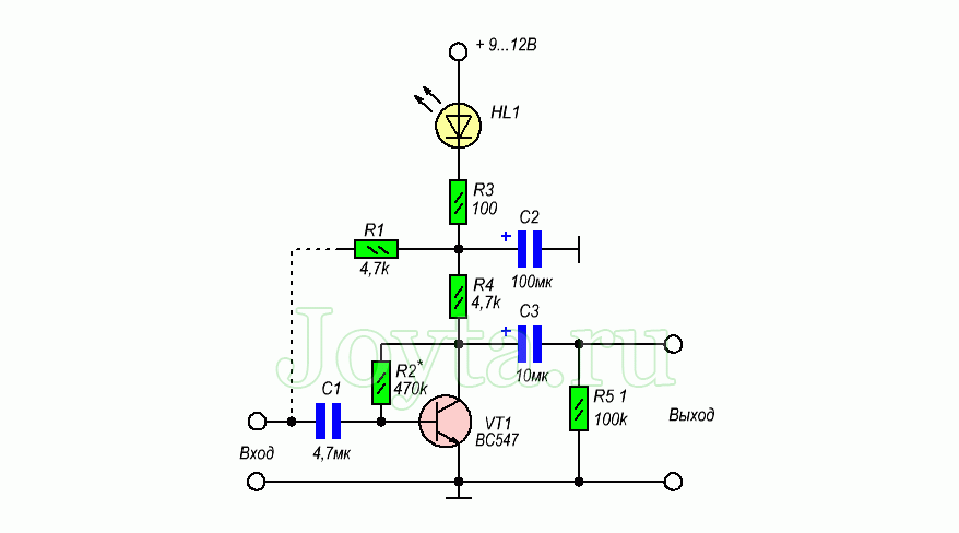 Резистор R1 используется только в сочетании с двухконтактным электретным микрофоном. Сопротивление 2,2 кОм обеспечит хорошую динамику.