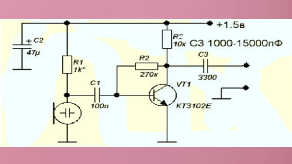 Электретный микро при громком звуке, выдаёт на выходе порядка 10-15 mV, поэтому для усиления сигнала до уровня 400-600 mV может использоваться схема с одним или двумя каскадами. Конструкция может быть собрана на обычном или полевом транзисторе и интегральной микросхеме. Усилитель микрофона на одном транзисторе выполнен на малошумящем приборе с обратной проводимостью. Схема подходит для применения в звуковых трактах персональных компьютеров. Достоинством устройства является низковольтное питание и его можно питать от пальчиковой батарейки на 1,5 вольта. Величину конденсатора С3 можно изменять в указанных пределах.